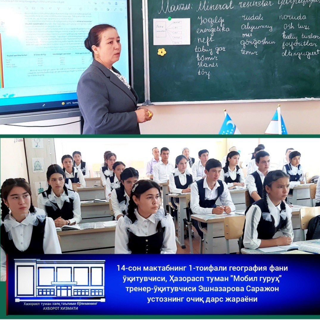 Hazorasp tuman maktabgacha va maktab ta`limi bo`limiga qarashli 14- umumiy o`rta ta`lim maktabining geografiya fani trenner o`qituvchisi Eshnazarova Sarajonning smenar mashg`ulotlari bo`lib o`tdi.