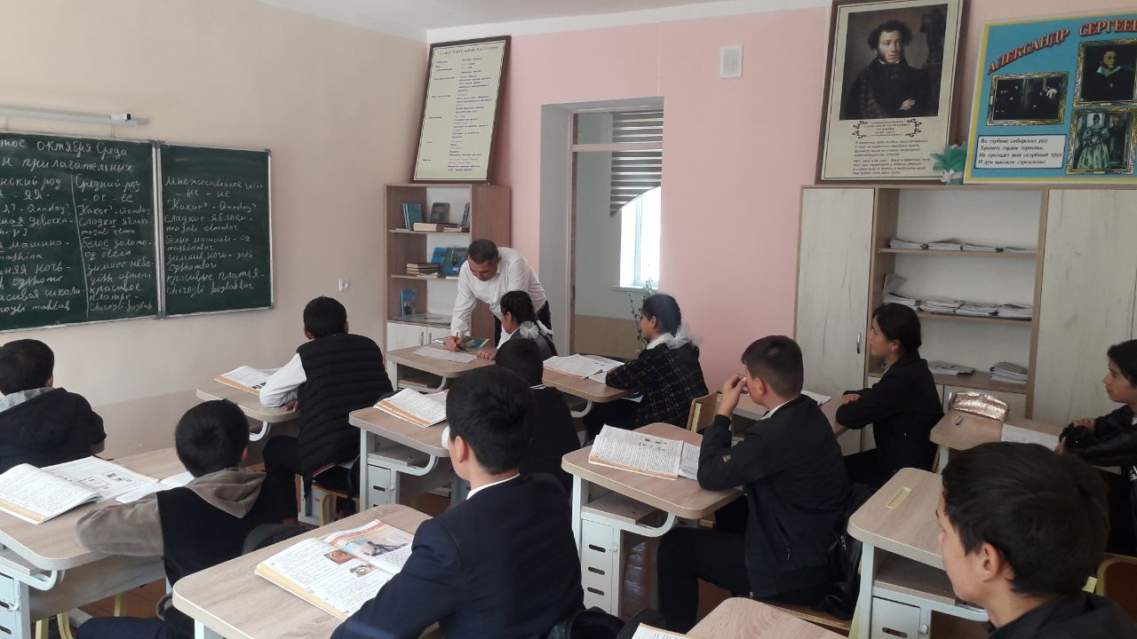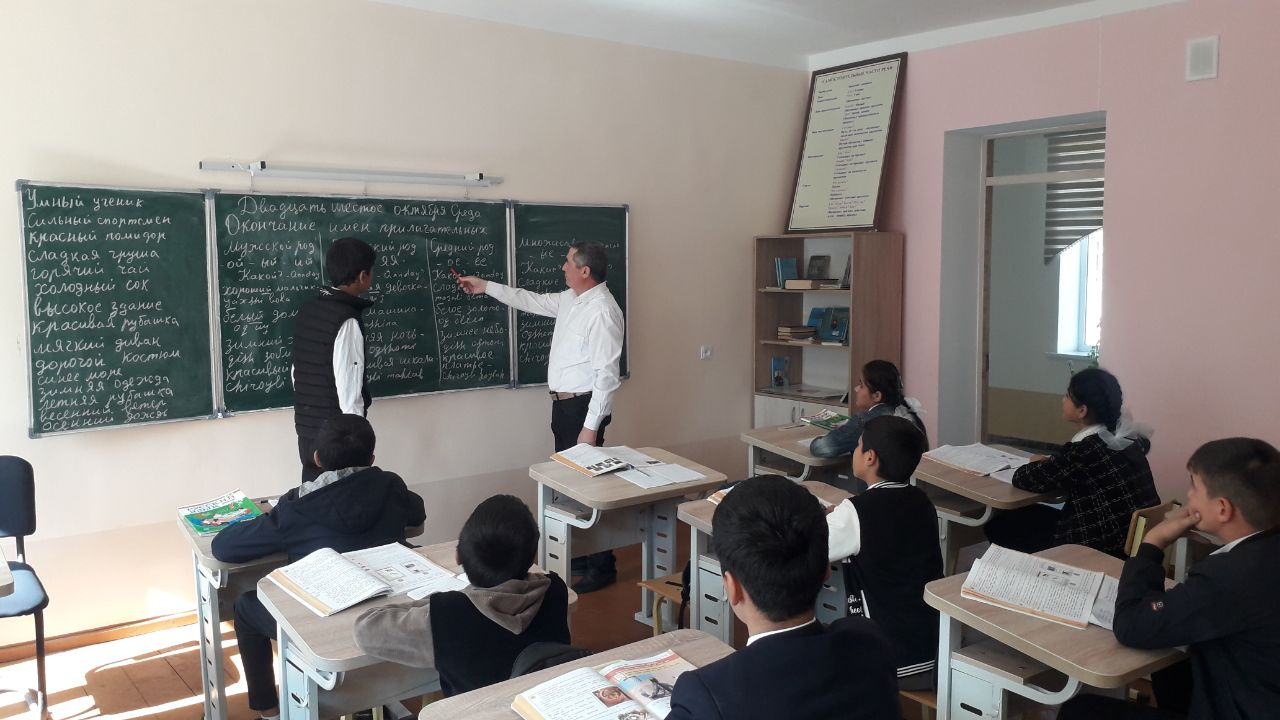 Hazorasp tuman Maktabgacha va maktab ta`limi bo`limiga qarashli 14-umumiy o`rta ta`lim maktabining rus tili fani o`qituvchisi va 7-B sinfida "Kраткие фории имён прилагатеых"mavzusidagi dars jarayonlaridan lavhalar