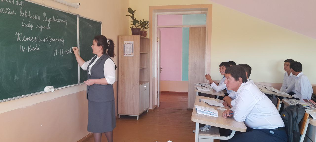 Hazorasp tumanidagi 14-son maktabning 9-b sinfida Huquq fani o'qituvchisi Jumanazarova Irodaning Konstitutsiyaviy huquq fanidan "O'zbekiston Respublikasi Tashqi siyosati"mavzusida dars mashg'ulotidan lavhalar