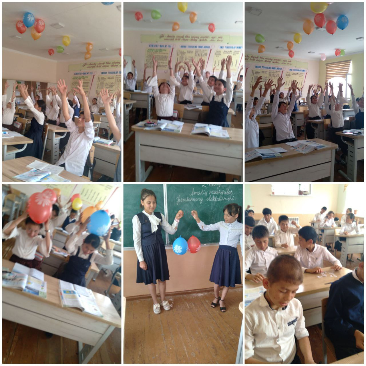 Xorazm viloyati Hazorasp tumani 14-son umumiy o'rta ta'lim maktabing Tabiiy fanlar o'qituvchisi Eshnazarova Sarajonning 6-sinflarda "Jismlarning elektrlanishi" mavzusida o'tkazgan amaliy mashg'ulotidan lavhalar.