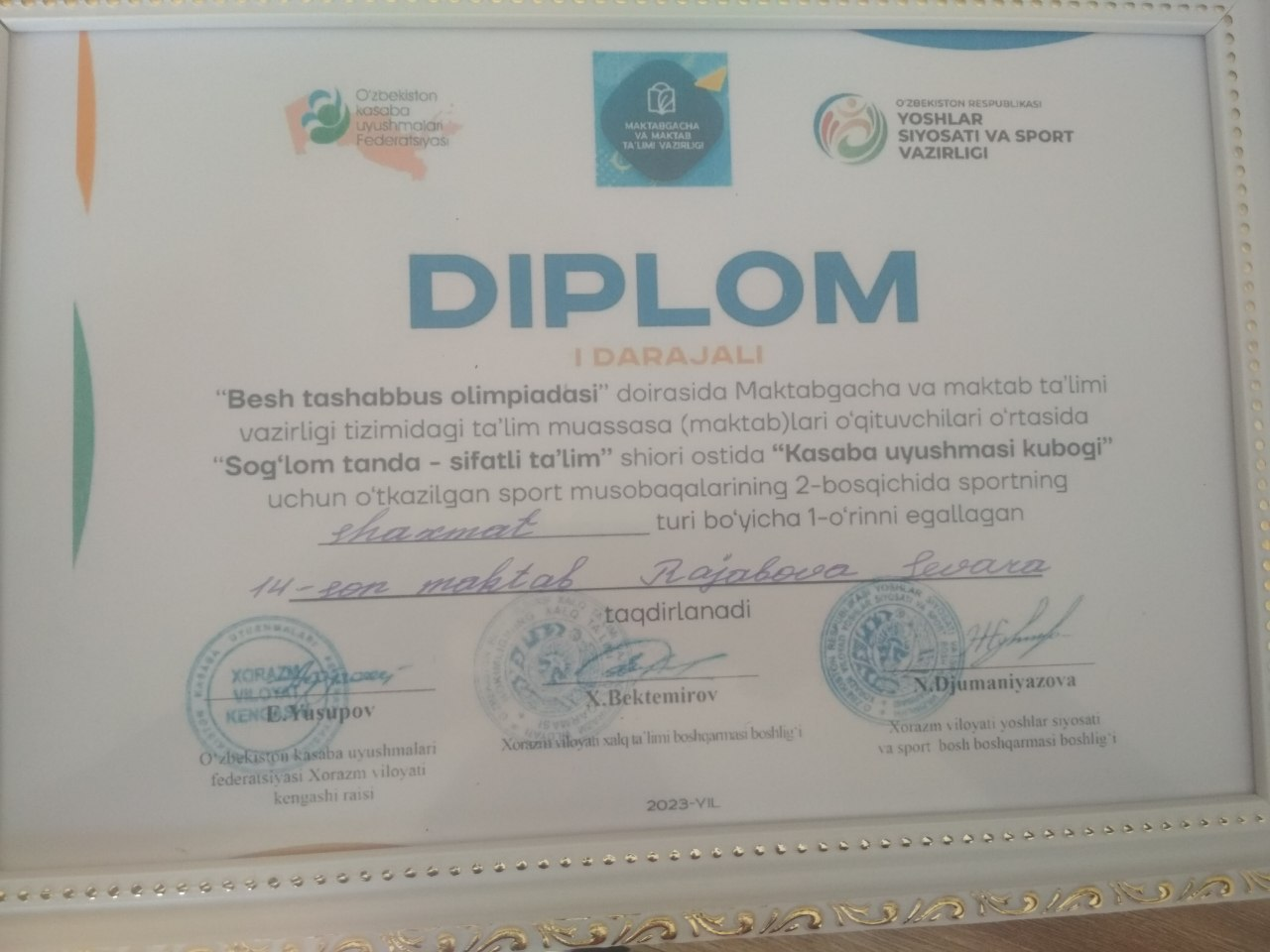 2-bosqich tuman olimpiada musobaqasida maktabimiz kadrlar bo`yicha menejer va boshlang`ich sinf o`qituvchisi Rajabova Sevara Oybekovna qatnashib faxrli 1-o`rinni egallab Hazorasp tuman Xalq ta`limi bo`limi mudiri va Kasaba uyushma rahbariyati tomonidan diplom va estalik sovg`alari bilan taqdirlandi va viloyat bosqichida qatnashish imkoniyatini qo`lga kiritdi.